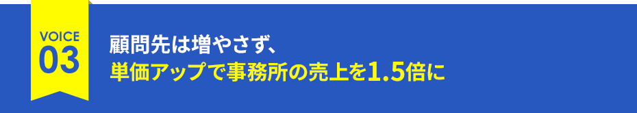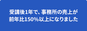 受講後1年で、事務所の売上が前年比150%になりました。売上2億5,000万円ダウン(約5割減)の顧問先を5億5,000万円のV字回復させることに成功しました。